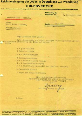 An Tisha B’Av 1941 erhielten wir einen Brief vom Hilfsverein in Berlin, dass wir wahrscheinlich im Juli oder August Deutschland mit dem Schiff „Buena Esperenza“ nach Spanien verlassen können. Unsere Freude war unbeschreiblich! Wir konnten es nicht glauben! Wir hatten wirklich die Möglichkeit, Deutschland zu verlassen! Einige Wochen zuvor hatten wir die Behörden gebeten, die Auswanderungslizenz zu verlängern. Die Gültigkeit unserer Pässe wurde bis 31. Juli 1942 verlängert. Am 19. und am 20. August bekamen wir zwei Telegramme von Hettis Onkel in New York und Ecuador, dass 70 Personen Kuba-Transit-Visa nach Ecuador bekämen und der Hilfsverein die Reise für diese Leute bezahle. Wir aber stünden nicht auf der Liste. Menschen, die ihre Ecuador-Visa später als wir bekommen hatten, standen auf der Liste. Am 26. August erhielten wir eine Antwort vom argentinischen Konsul, dass er noch kein Transit-Visum für uns erhalten hatte. Der August ging zu Ende und wir waren immer noch in Recklinghausen – es schien, als ob wir nicht mehr aus Deutschland herauskommen sollten. Hetti hat dann beschlossen, persönlich nach Berlin zu fahren. Was konnten wir verlieren? Es gab nichts zu verlieren, nur zu gewinnen! Eine Reise nach Berlin in jenen Tagen war kein Vergnügen. Ein Weg dauerte etwa 8-9 Stunden. Und wir hatten ein Baby zu Hause. Frau Eichenwald sorgte für unser Kind. An einem der letzten Tage des August begann eine Reise, die Hetti und unser ganzes zukünftiges Leben beeinflussen würde!